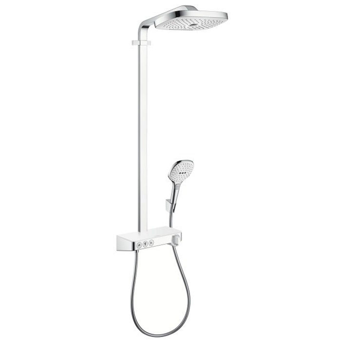 HG Raindance Select E Душевая система Showerpipe: верх.душ 300 3jet, ручн.душ, шланг, термостат с полочкой, цвет: белый/хром