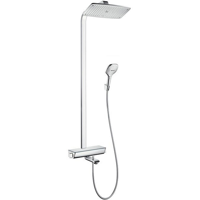 —Hansgrohe Raindance Select Showerpipe 360 Душевой гарнитур, в набор входят: термостат с запорным и переключающим вентилем, переключатель для ручного душа, верхний душ Raindance E AIR 1jet 360*190 мм, ручной душ Raindance Select 150 3jet, душевой шланг