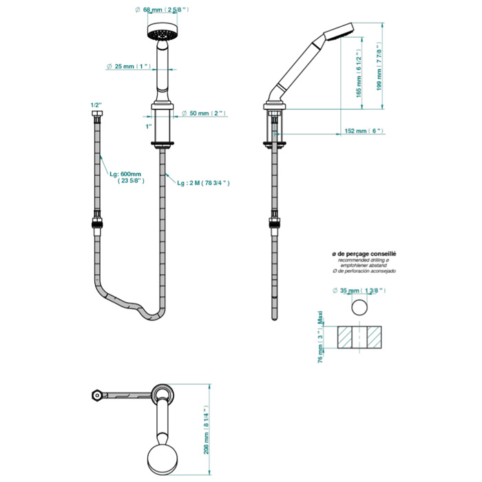 THG BAGATELLE PIERRE NOIRE Ручной душ для установки на борт ванны, в комплекте со шлангом 2000 мм., цвет полированное золото