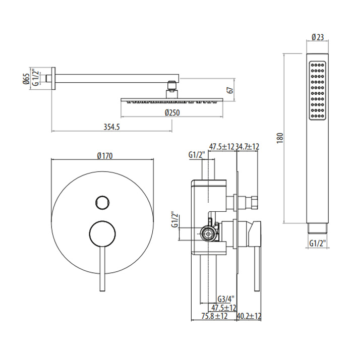 GATTONI CIRCLE TWO/ONE Комплект для душа со встроенным смесителем с ручной лейкой и верхним душем 250 мм, цвет: хром