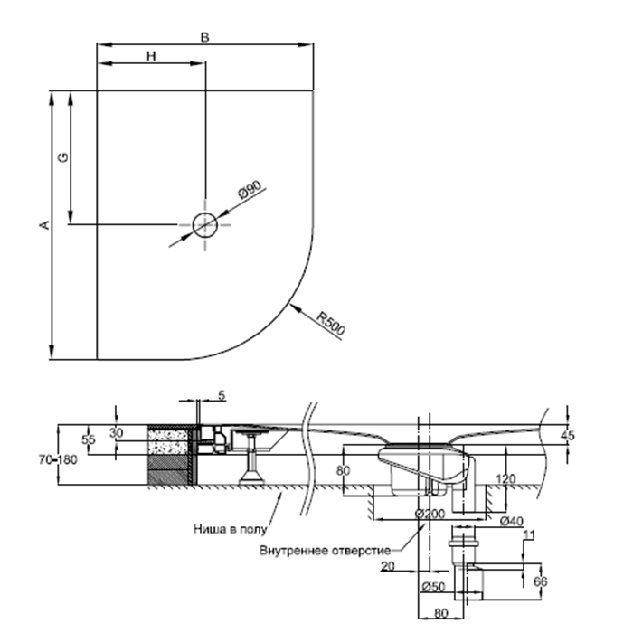 BETTE Установочная система для встраивания в уровень с полом для квадратного поддона с закругл углом 90х90см