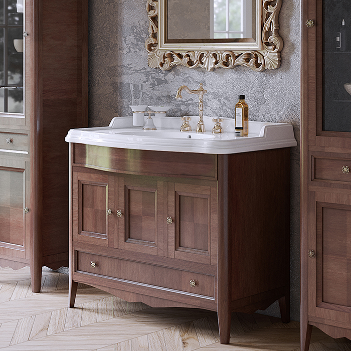 TW Veronica, База с раковиной Simas AR874bi*1 105*56см, с 1отв., 3 расп. дв. и 1ящик, доводч. Blum, ручки: Riflesso бронза, цвет: noce