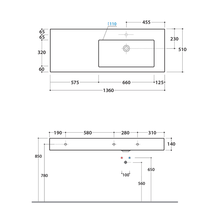 GLOBO Incantho Раковина с крылом справа, подв (1360х510 мм) без отв-я под смесит, цвет: белый (Со Склада продаем только с консольюTL135RU !!!)
