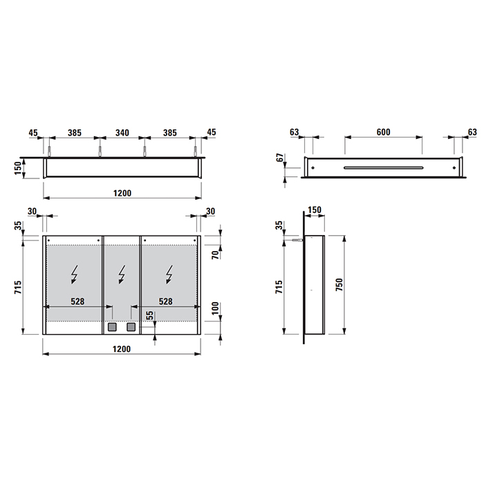 LAUFEN FRAME 25 Зеркальный шкаф 1200х150х750 мм., 3 двери, LED подсветка, подсветка снизу, сенсорный выключатель, 2 розетки, цвет Mirror