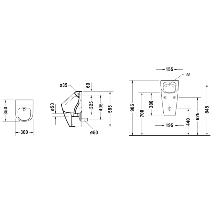 —Duravit ME by Starck Писсуар Rimless 0,5л., 30х35см, без смывного края, подача воды сзади, с вытяжкой, сток горизонтальный, включая крепление, модель с „мушкой