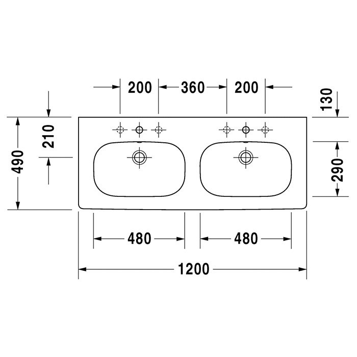 Duravit D-Code Двойная раковина для мебели, с перел., с 3 отв. под смес., 1200x490мм, Цвет: Белый
