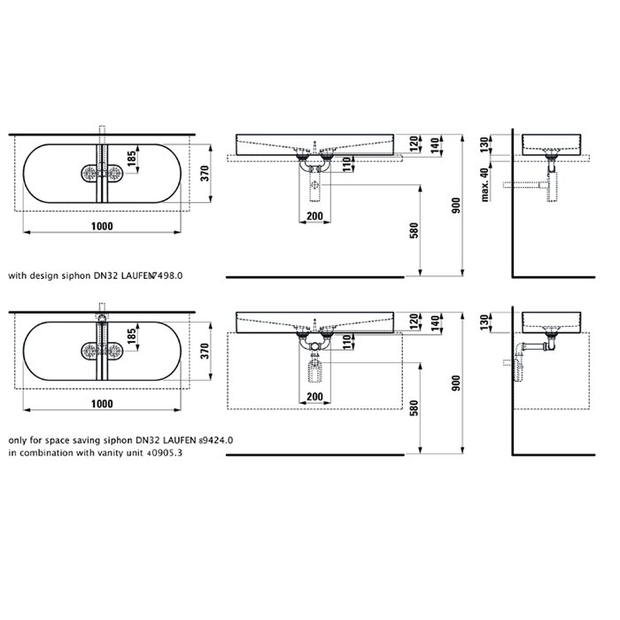 Laufen Sonar Раковина двойная 1000x370х130мм без перелива, без отв. под смеситель, цвет: белый