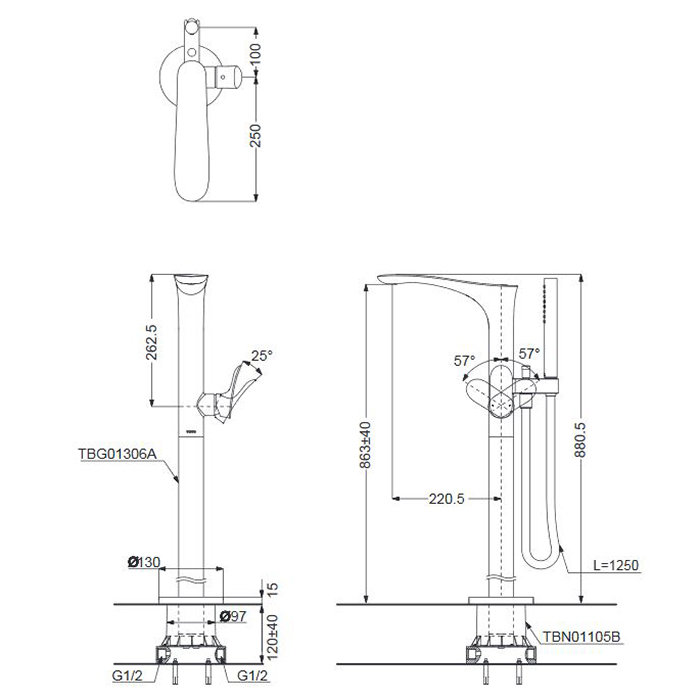 TOTO NC Смеситель для ванны, 135x365x880мм, отдельностоящий с ручным душем, Active Wave, цвет: хром (без встроенной части TBN01105R)