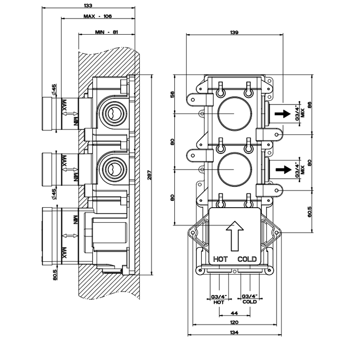 —Gessi Внутренняя часть встраиваемого термостатического смесителя с 2мя независимыми выходами