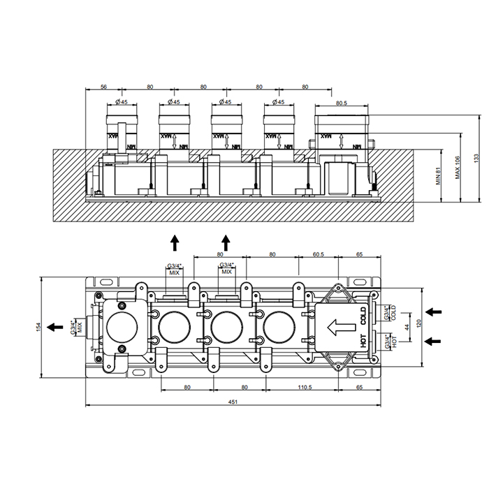 —Gessi Hi-Fi Встраиваемые части для термостатического смесителя, до 3 источников одновременно, 3/4" соединение., цвет: хром