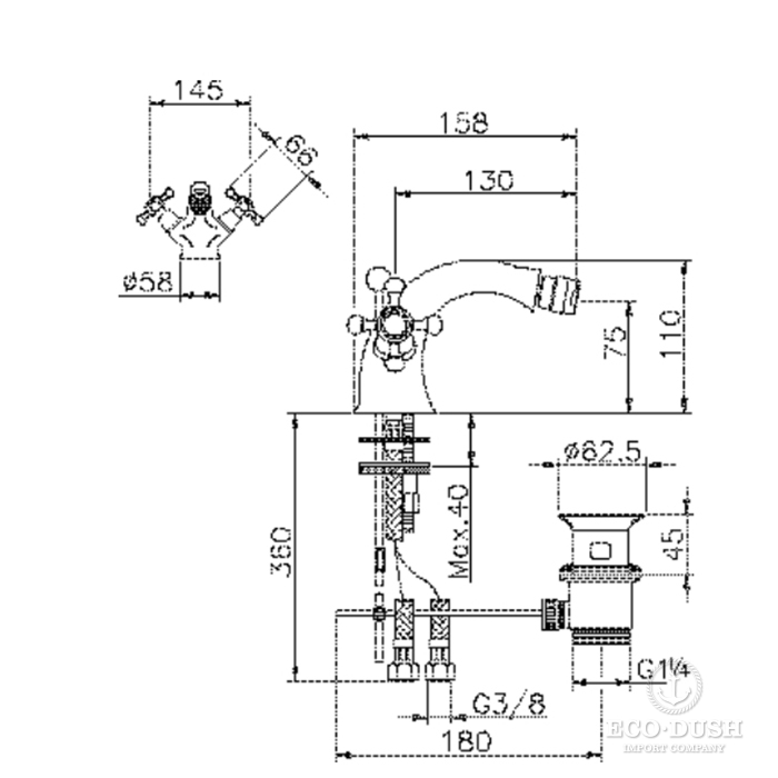 HUBER Victorian Смеситель двухвентильный для биде на 1 отверстие с донным клапаном, цвет никель матовый (акция на товар из наличия)