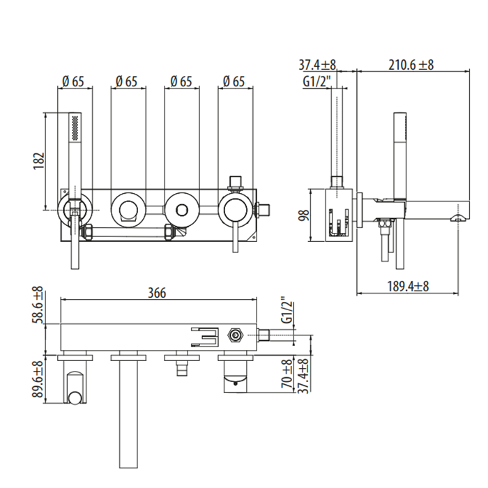 Gattoni Circle One Смеситель встроенный для ванны на 4 отв., с внутр частью, с ручной лейкой. цвет: черный матовый