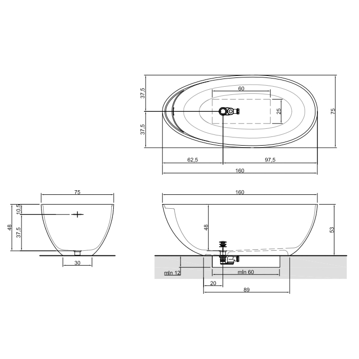 Antonio Lupi Eclipse Ванна отдельностоящая, овальная, 160х70х53см, с донным клапаном (хром), сифоном, мат-л: Cristalplant, цвет: белый
