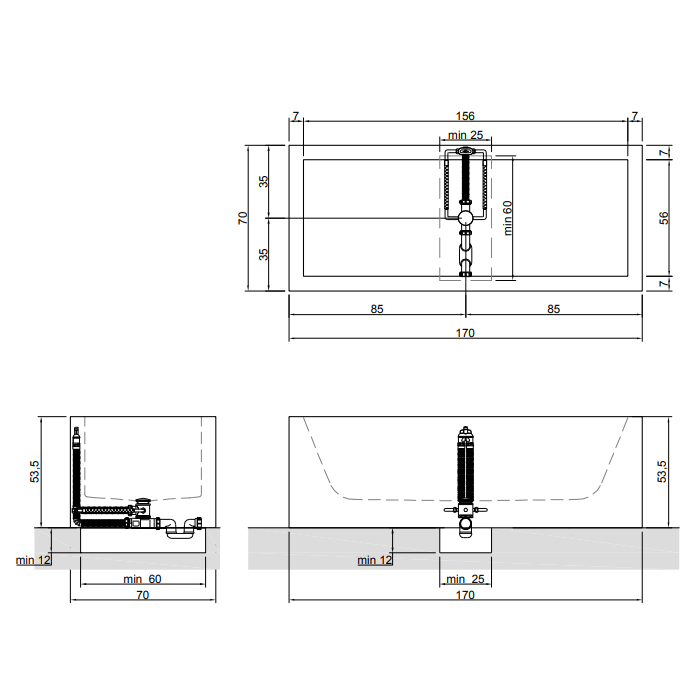 ANTONIO LUPI BIBLIO Ванна пристенная (2стороны) 170х70х53.5 см, с сифоном и ,ножками и донным клапаном (хром), мат-л: Corian, цвет: белый