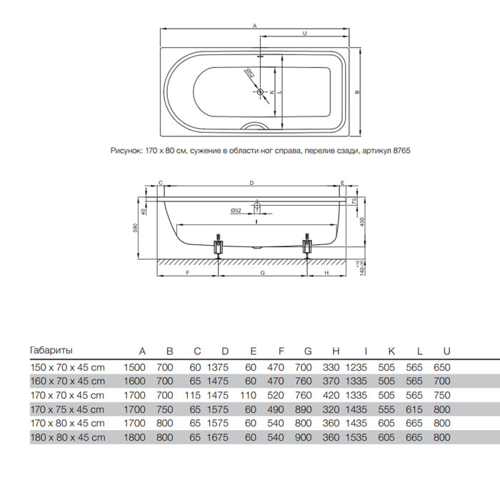 BETTE Ocean Ванна с шумоизоляцией 170х75х45, перелив сзади, с BetteGlasur ® Plus и покрытием анти-слип, белая (для удлиненного слива-перелива)