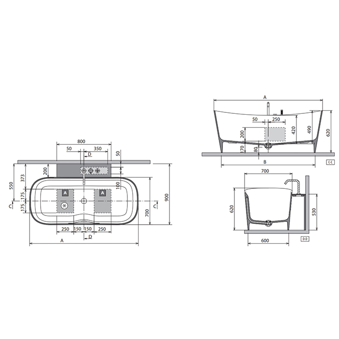 NOVELLINI SHIP Ванна пристенная 1600х900х620 мм., в комплекте с смесителем хром, с донным клапаном click-clack, NOVOTECH, цвет белый матовый